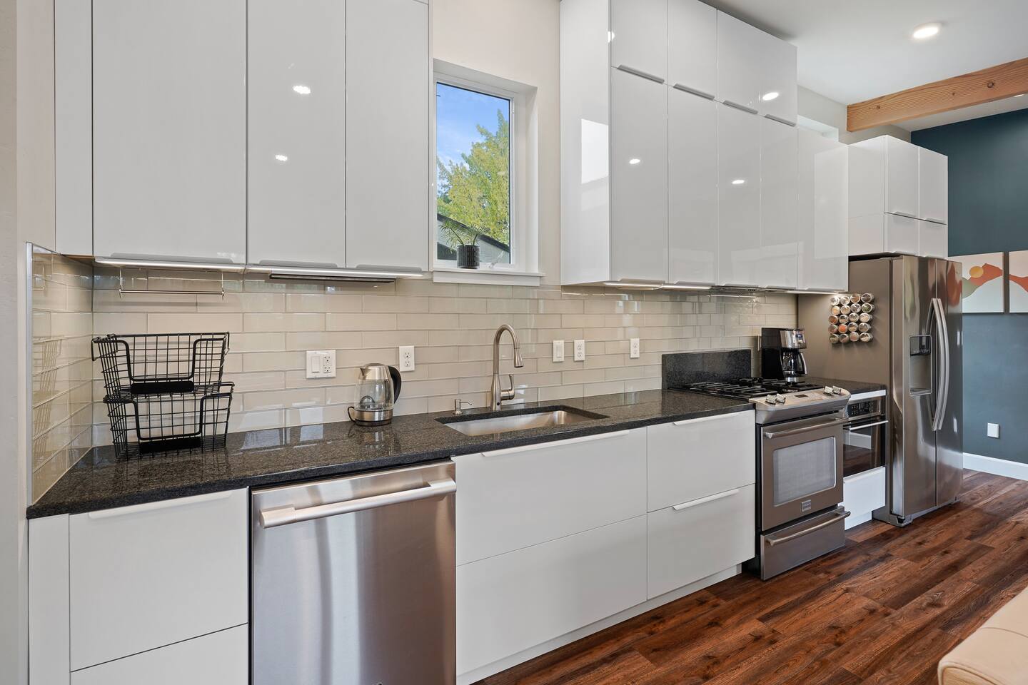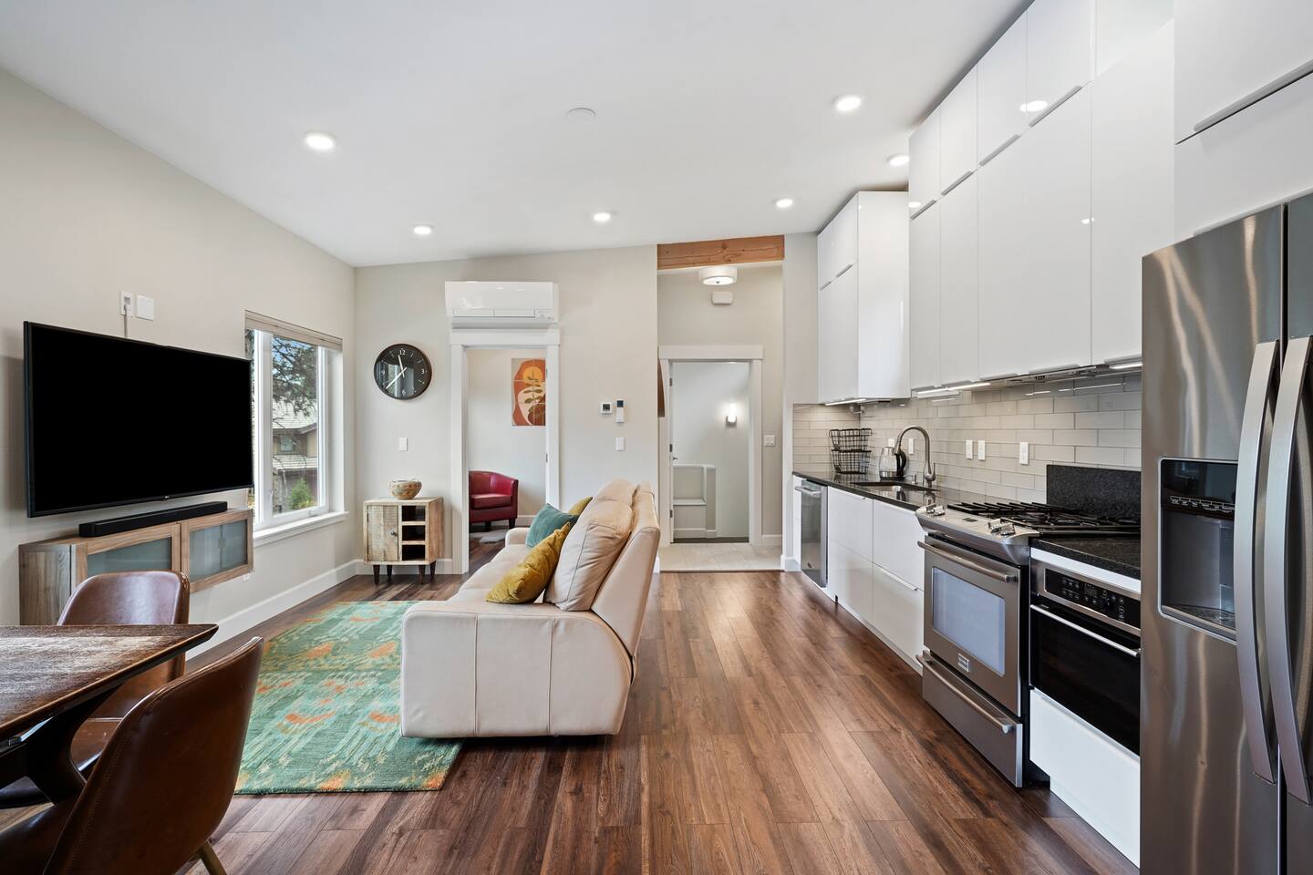 Exuding natural light and clean simplicity. A few quick steps away from gorgeous First Street Rapids park, enjoy a peaceful stroll downtown on the Deschutes River Trail. Modern amenities include heated floors, king bed and soaring ceilings. Soak up sun and nature sounds on the patio. No parties or pets please. Trip insurance recommended if illness, weather or smoke may be an issue. Please note there is construction next door by the property owner, a contractor. Noise limited to working hrs.
