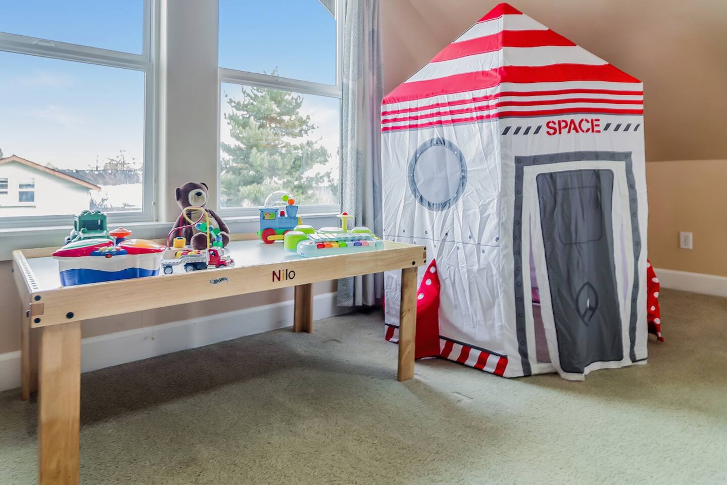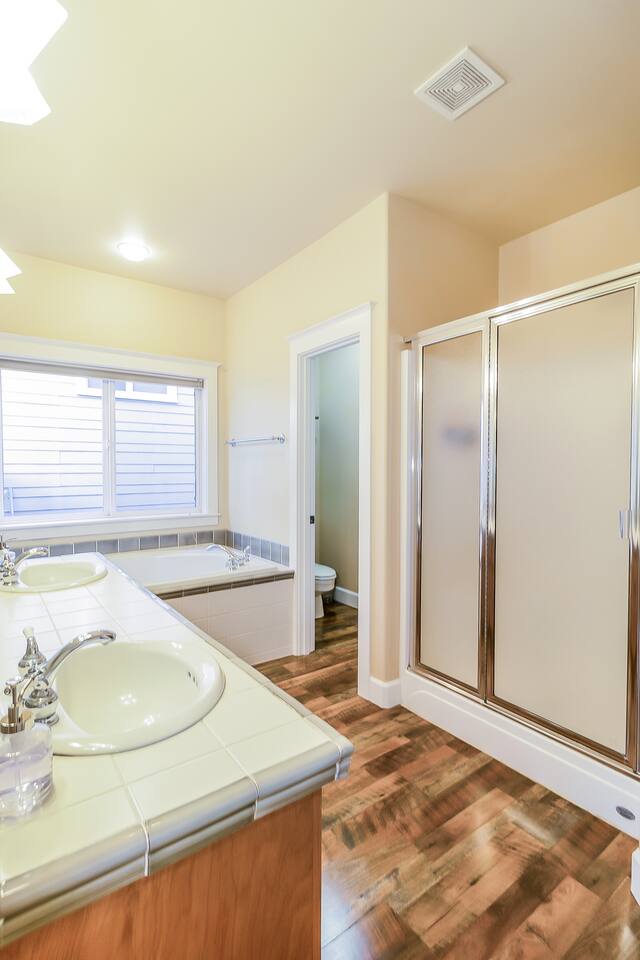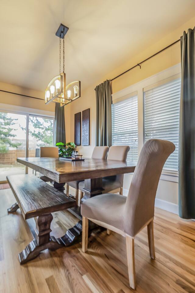 Bring the whole crew to this spacious home perfect for families and groups. Inviting lighting and hardwood floors downstairs. Primary bedroom on the main. Nestled in a quiet neighborhood, soak up the sunshine in the privacy of the fenced backyard. Kids can explore the bonus room play area with extra toys and a comfy couch for movies. Near Lone Pine Coffee, Hablo Tacos and Pine Nursery Park featuring trails, fishing pond, playground, pickleball and beach volleyball courts.